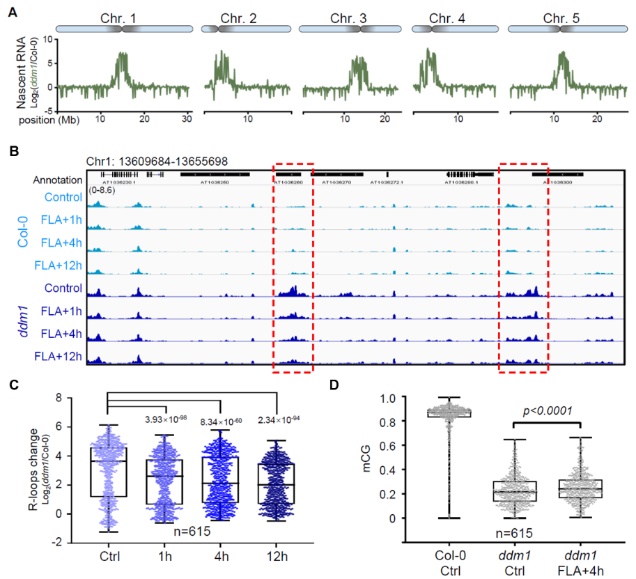 DDM1是SWI/SNF家族蛋白的一员,早在1993年就发现其突变后会导致全基因组甲基化水平降低,但背后的机制仍然未知。通过ChIP-seq结果显示DDM1富集在染色体的着丝粒周围区域,而DDM1的突变会引起该区域的异染色质水平下降以及转录水平升高。有趣的是,转录抑制剂FLA可以显著降低ddm1突变体中R-loop在着丝粒附近的富集,同时部分回补DNA甲基化在ddm1中的缺失(图2)。这些结果说明,DDM1可抑制与转录耦联的R-loop异常积累,从而确保着丝粒附近的DNA甲基化等异染色质状态正常建立。