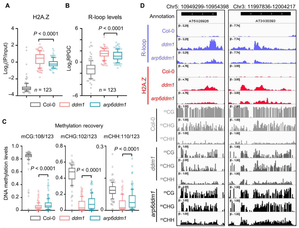 由于H2A.Z在染色体上的定位由SWR1复合物介导,作者在ddm1背景下对拟南芥SWR1复合物的关键因子ARP6进行敲除,发现ddm1arp6双突可以一定程度上降低H2A.Z的积累,同时回补ddm1升高的R-loop和降低的DNA甲基化水平(图5)。这些结果说明,DDM1可以抑制H2A.Z在着丝粒周围区域的积累,同时解除由H2A.Z富集带来的转录耦联R-loop,从而促进异染色质的形成。