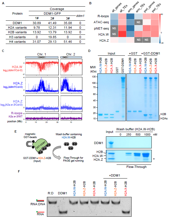 为了深入探索DDM1促进异染色质形成的机制,作者通过结合免疫沉淀-质谱分析寻找DDM1的互作蛋白。结果显示,DDM1可以和多种H2A组蛋白变体互作,其中H2A.W与H2A.Z两种变体在基因组上的分布是互斥的(图4A和B)。ChIP-seq结果显示,DDM1功能缺失的突变体中,着丝粒区域的H2A.W含量下降,而H2A.Z含量上升(图4C),说明野生型中异染色质区域定位的DDM1阻止了H2A.Z在该区域富集。体外互作结果表明,DDM1可以分别与H2A.W-H2B、H2A.Z-H2B二聚体互作(图4D),但是H2A.W-H2B可以抑制DDM1与H2A.Z-H2B复合物的形成(图4E),这也解释了在野生型中DDM1可以帮助H2A.W定位在着丝粒周围区域、同时抑制H2A.Z在该区域的富集这一现象。有趣的是,DDM1与H2A.W-H2B、H2A.Z-H2B均可抑制DDM1的解旋酶活性(图4F),而H2A.W的三突变体h2a.w-3中R-loop水平并没有显著升高(图4C),表明DDM1解除R-loop和调控H2A变体定位的这两种功能相互独立。