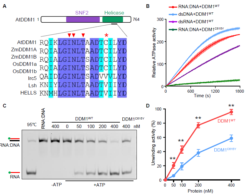 DDM1的N端和C端都有保守的解旋酶结构域(图3A),并且拟南芥ddm1-1突变体在C端解旋酶保守结构域中发生了C615Y的氨基酸残基突变。体外结果显示,RNA:DNA杂合链可以显著激活DDM1蛋白的ATPase活性,并且体外重组的DDM1蛋白可以RNA从RNA:DNA杂合链结构中解离,但是突变体蛋白DDM1C615Y的解旋酶活性显著下降(图3)。结合in vivo数据,表明DDM1可以直接清除在异染色质区域瞬时转录产生的R-loop结构,并促进异染色质形成。