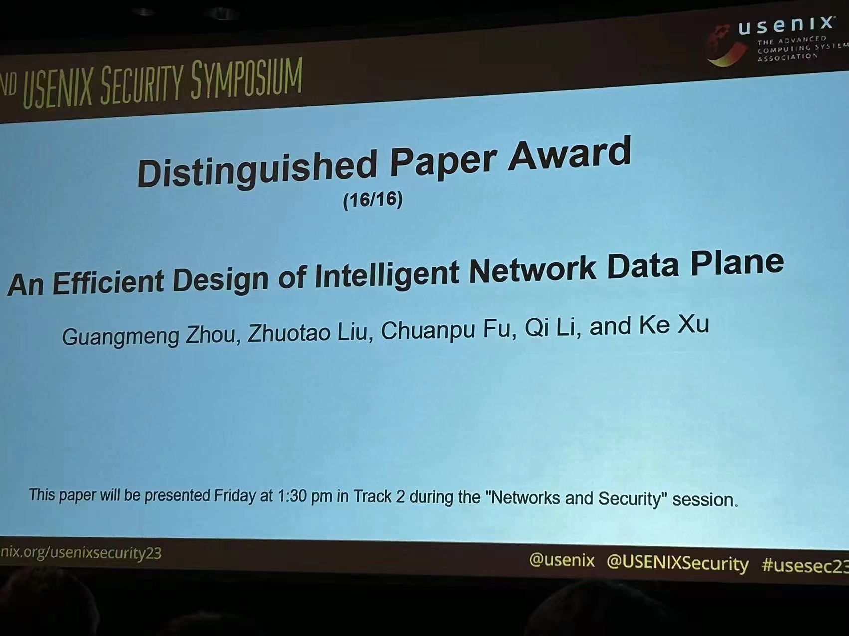 开云新闻网8月18日电 8月9日至11日,第三十二届高等计算机协会安全研讨会(USENIX Security)在美国加州举办。kaiyun开云官方网站计算机系教师徐恪和网络研究院教师刘卓涛、李琦团队发表的论文“智能网络数据平面”(An Efficient Design of Intelligent Network Data Plane)荣获杰出论文奖(Distinguished Paper Award)。这是USENIX Security历史上首次由中国研究机构及学者独立完成的研究成果荣获该奖项,kaiyun开云官方网站因此成为以第一单位获得网络空间安全领域四大旗舰会议杰出论文最多的国内科研机构,在全世界亦名列前茅。
