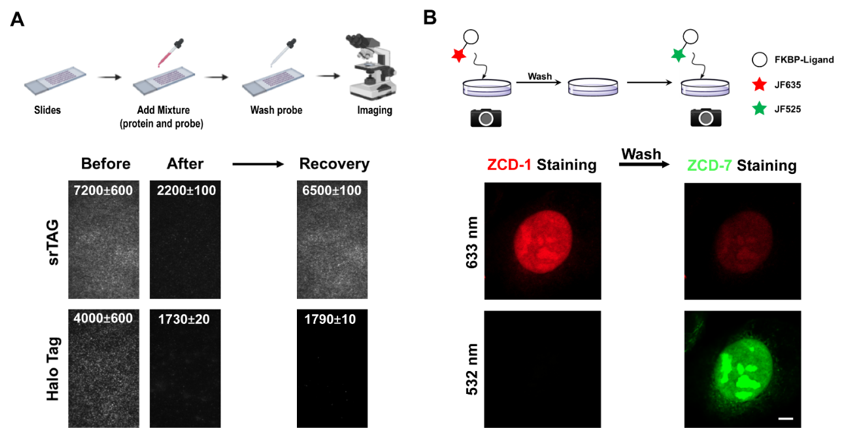 随着蛋白质标记技术的发展,活细胞荧光成像已成为研究蛋白质功能和定位的常规工具。而小分子染料的兴起和利用荧光团的位点特异性结合的自标记标签的开发扩大了荧光成像工具箱。与广泛采用的荧光蛋白相比,自我标记蛋白(如HaloTag、SNAP-Tag)提供了更灵活的染料光谱特性选择、更高的亮度和光稳定性。然而,在荧光成像实验中,光漂白在一定程度上限制了空间和时间分辨率以及成像持续时间。