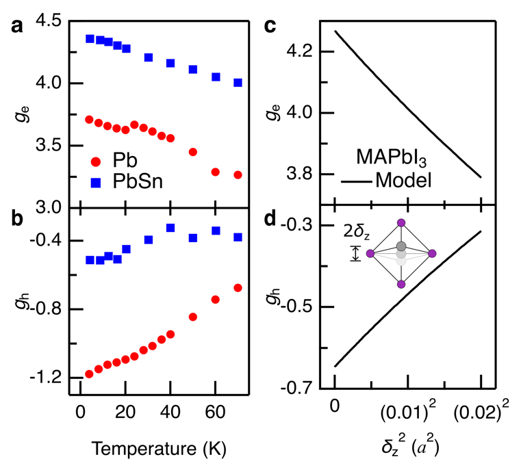 图3.测得的电子和空穴朗德g因子随温度的剧烈变化(a,b)及其理论模型(c,d)
