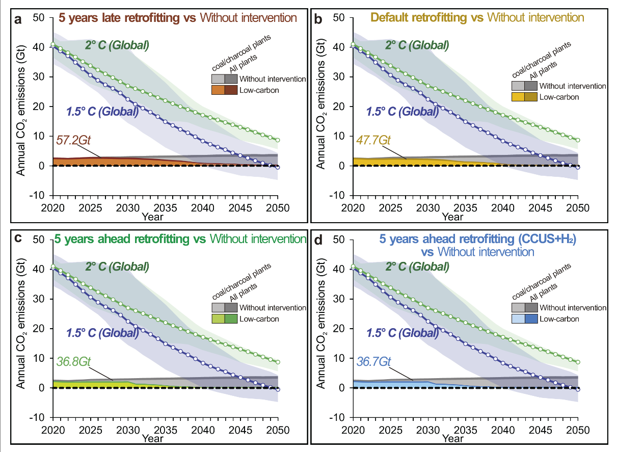 图2.不同低碳技术演进路径下全球钢铁厂2020-2050年间累积二氧化碳排放