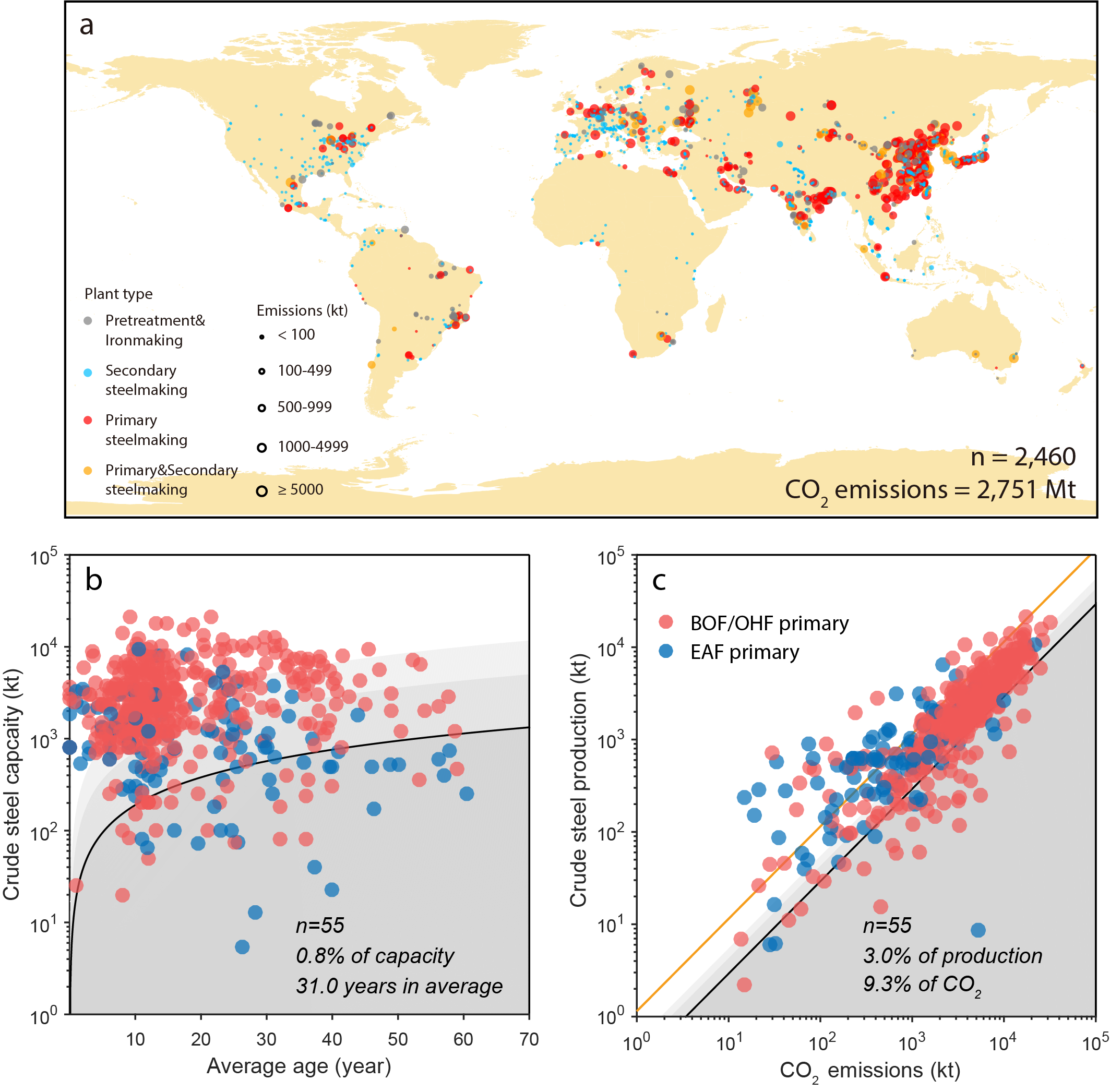图1. 2019年全球钢铁厂二氧化碳排放、服役年限-产能比和碳排放强度