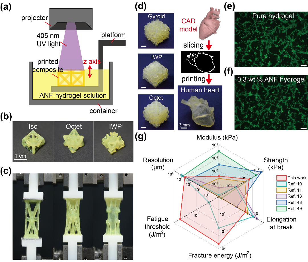 图4.芳纶纳米纤维增强的水凝胶复合材料的3D打印、生物相容性和性能对比