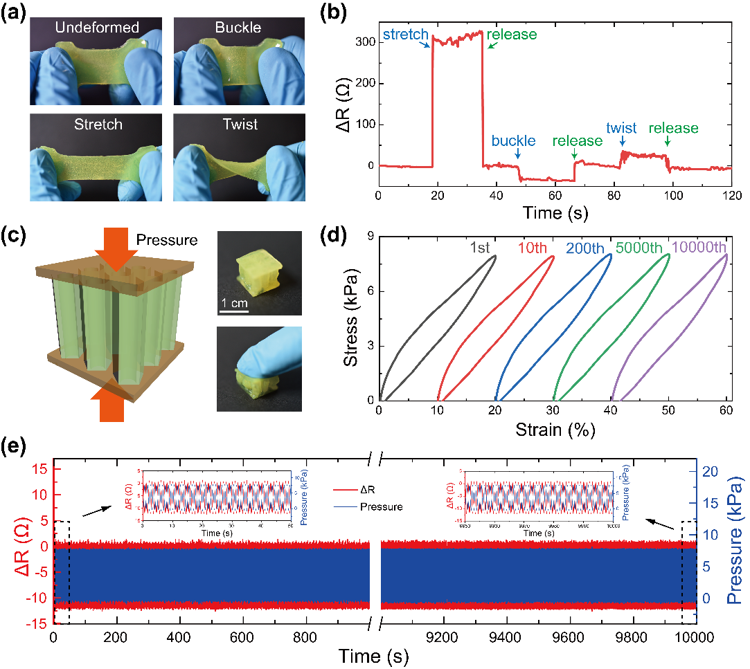芳纶纳米纤维增强的水凝胶复合材料可以用于制备具有复杂几何形状的点阵结构和生物组织结构,并具有较高的3D打印分辨率和良好的生物相容性,与其他基于DLP技术的可3D打印水凝胶相比展现出优异的力学性能和打印分辨率(图4)。在前驱体溶液中加入电解质可以使芳纶纳米纤维增强的水凝胶复合材料具有导电性,其电阻值随着应变的改变而变化,通过3D打印制备的压力传感器在10000周疲劳加载下能够保持稳定的力学性能和电学性能(图5)。此研究为改善基于DLP的3D打印水凝胶的力学性能提供了一个普遍而有效的策略。