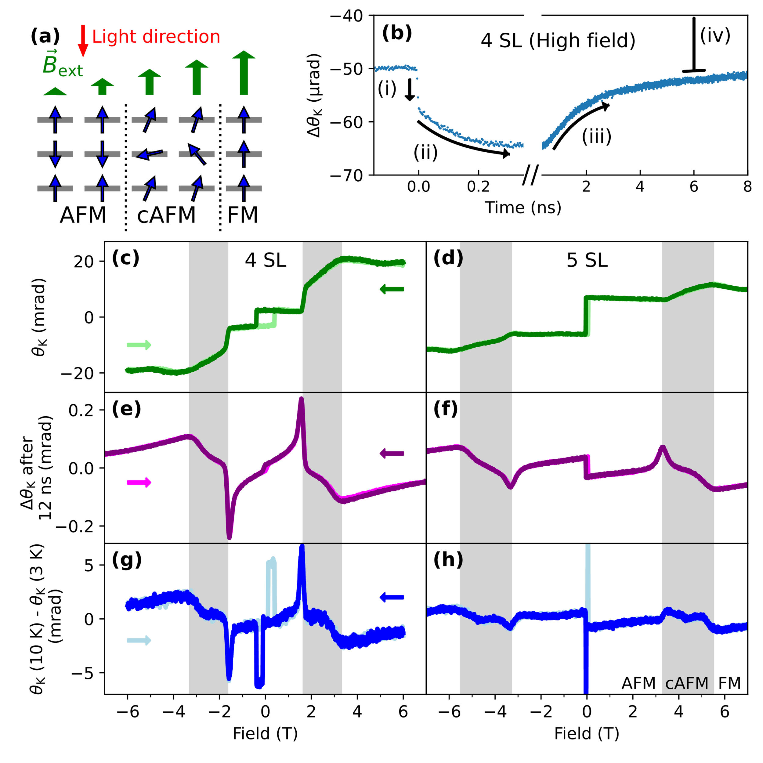 图1.面外施加磁场测量的静态与瞬态磁光克尔信号。(a)法拉第构型的实验示意图。样品随着磁场强度的增加从反铁磁(AFM)转变为倾斜反铁磁(cAFM)再到铁磁(FM)序。(b)3 K温度强磁场下的典型瞬态克尔信号,有4个不同的特征:前两个(~1皮秒与几百皮秒)为超快退磁过程,后两个(几纳秒与~100纳秒)为磁态恢复过程。(c, d)4层与5层样品的静态磁光信号。(e,f)4层与5层样品在12纳秒处的瞬态磁光克尔信号。与静态磁光信号相比,磁状态的转变在瞬态磁光信号中更显著。(g,h)4层与5层样品在10K与3K的静态磁光信号差值,与瞬态磁光信号非常相似,表明超快退磁由激光热效应产生