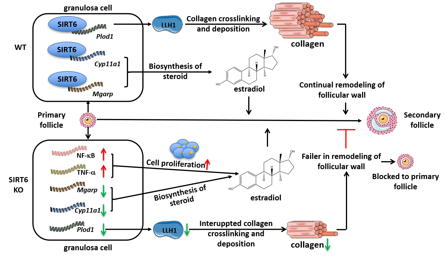 胶原蛋白是一大类糖蛋白,是组织的结构基石,是细胞外基质(ECM)的主要成分,对卵泡的发育非常重要,有助于卵泡液的形成,过滤可溶性物质,并为组织提供刚性或弹性的机械支持。既往研究表明,基质缺乏会抑制颗粒膜的去极化转化,导致卵泡发育迟缓。例如甲状腺功能减退导致雌性大鼠生殖功能障碍,其主要作用机制是下调胶原生物合成途径第一步关键酶(Plod1、Plod2和Plod3)的表达,进而干扰卵巢胶原生物合成。在卵泡发育过程中,随着卵泡壁的扩大,卵泡壁会发生不断的重塑,Plod基因的下调会抑制新胶原的形成,导致胶原状态和卵巢结构的整体紊乱,导致卵泡发育异常,同时也影响类固醇的合成。该项研究显示,SIRT6 缺失会导致小鼠卵巢发育异常,包括初情期、动情周期的中断,其卵巢中大部分卵泡停滞在初级卵泡阶段,卵巢间质中胶原蛋白表达显著降低。在SIRT6缺失的颗粒细胞和卵巢中,胶原蛋白合成相关基因Plod1的mRNA及蛋白水平均显著下调。ChIP实验证明SIRT6直接与Plod1基因结合并调节其表达,这表明SIRT6缺失通过下调Plod1表达和胶原形成导致卵泡发育不全。