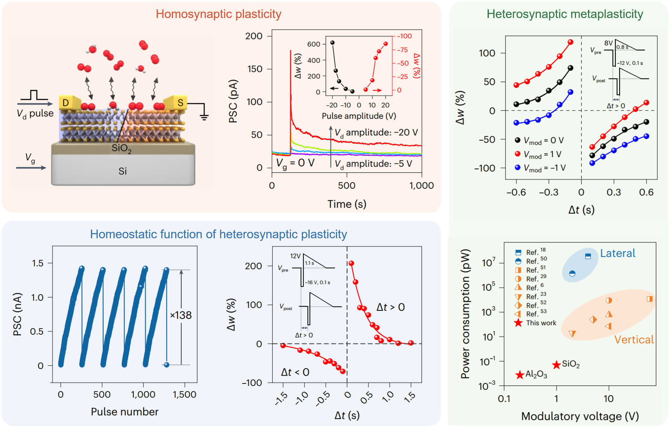 图3.基于有效栅压调控的梯度掺杂模拟生物同突触可塑性、异突触可塑性的稳态功能和异突触元可塑性功能