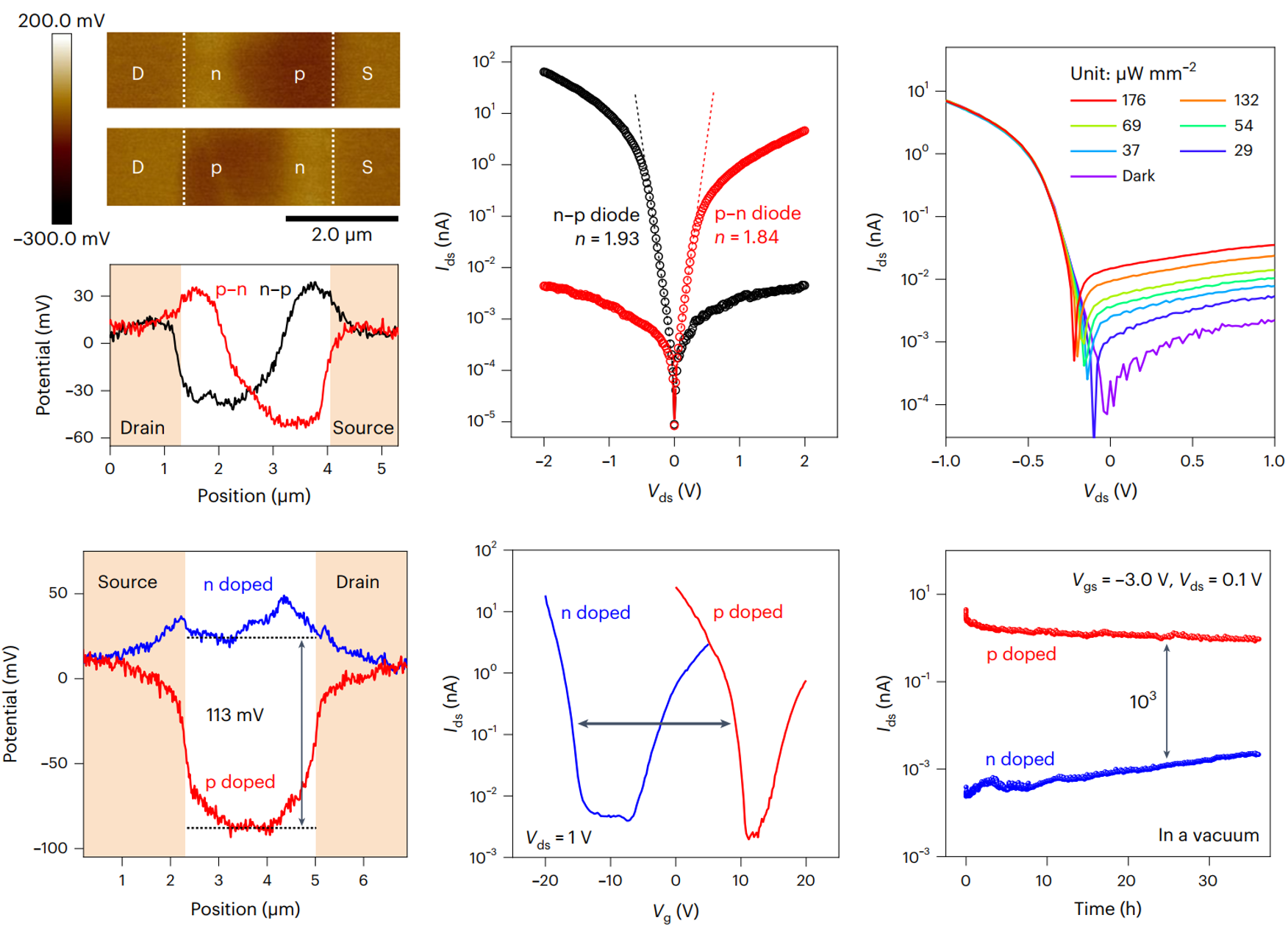 开尔文探针力显微图像显示,通过精确调控的梯度掺杂,可以分别将可重构MoTe2器件重构为np结和pn结、p掺杂和n掺杂四种状态,从而实现极性可调的二极管功能和存储器功能。在二极管状态下,器件的整流比可达104,并且拥有光电探测能力。作为存储器,器件拥有约25V的存储窗口,存储比超过103,保持时间超过36h(图2)。
