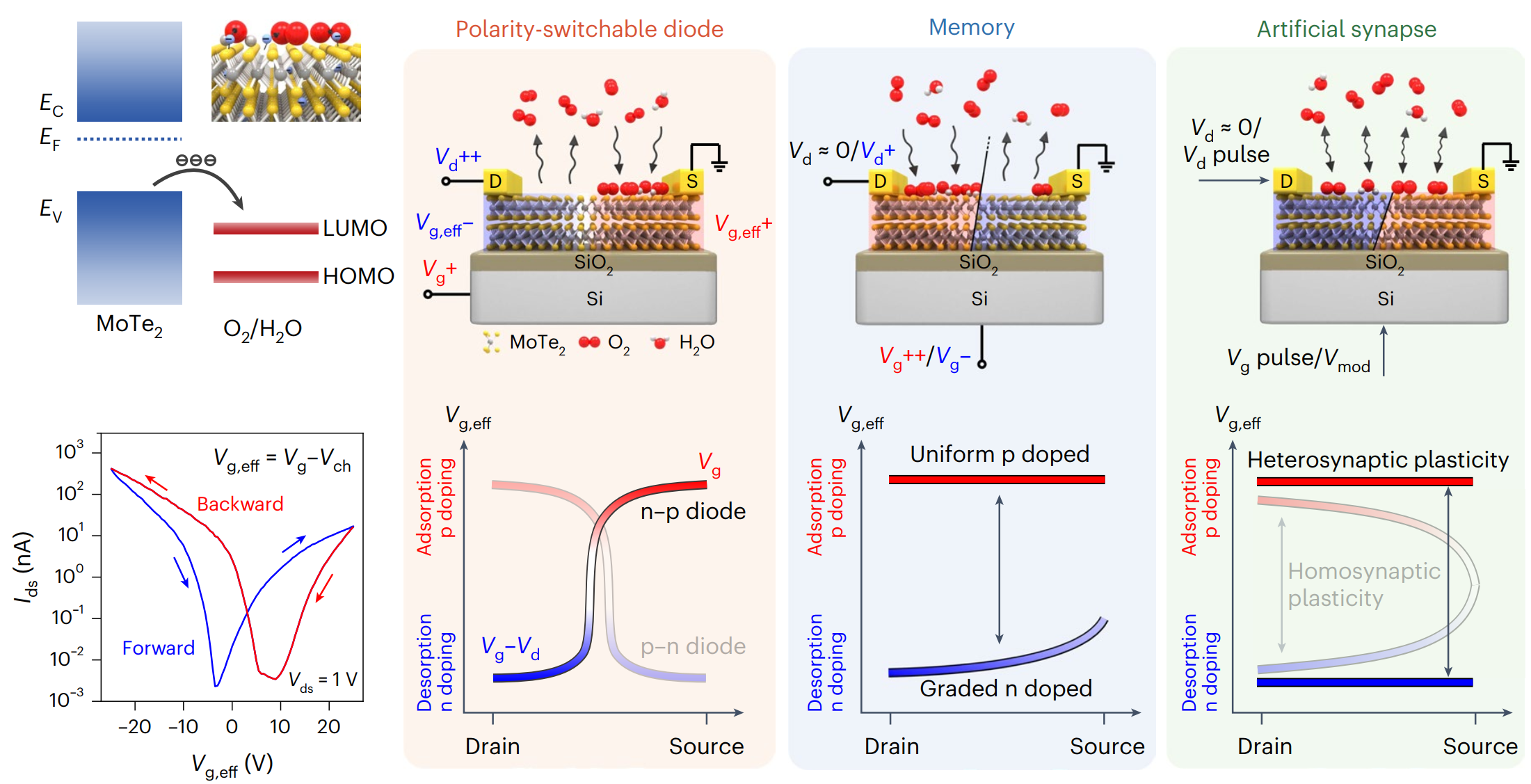 图1.单栅极可重构MoTe2器件的掺杂机理和基本工作原理
