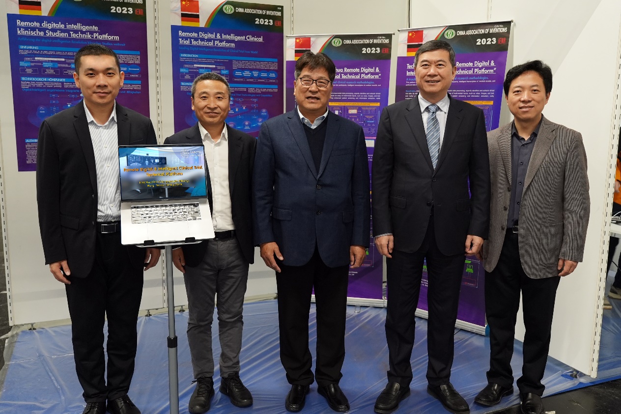 董家鸿(右二)、中国发明协会副会长贺振福(中)与项目团队成员赵邑(右一)、冯晓彬(左二)、黎成权(左一)