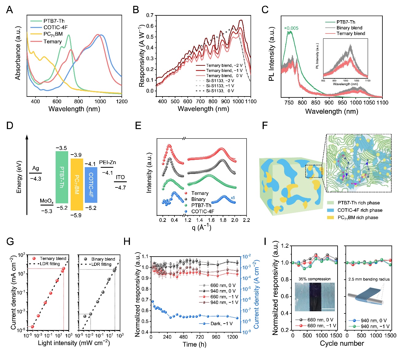 有机半导体聚合物PTB7-Th与非富勒烯小分子受体COTIC-4F的特征光吸收覆盖了血氧饱和度检测窗口(660和940 nm),通过富勒烯分子PCBM改性以及超薄超柔性器件结构设计使光电探测器表现出优异的性能(图2)。