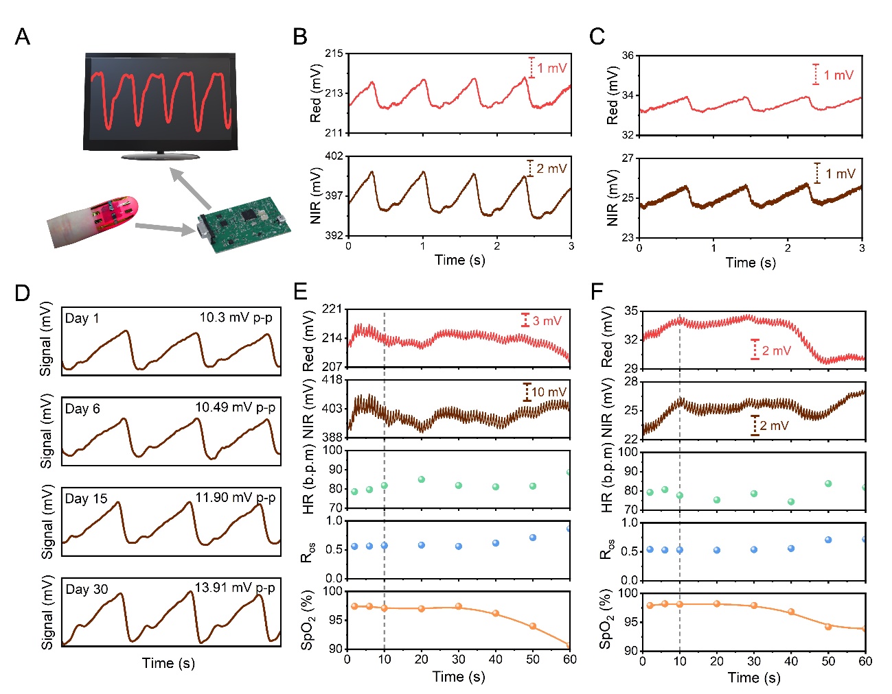 所构建的超柔性PPG传感器在红光和近红外光下具有高响应度和探测率以及低响应时间,在相同功耗下具有比硅基器件更可靠的PPG信号检测能力,实现动态与缺氧条件下的血氧饱和度精确测量(图3)。