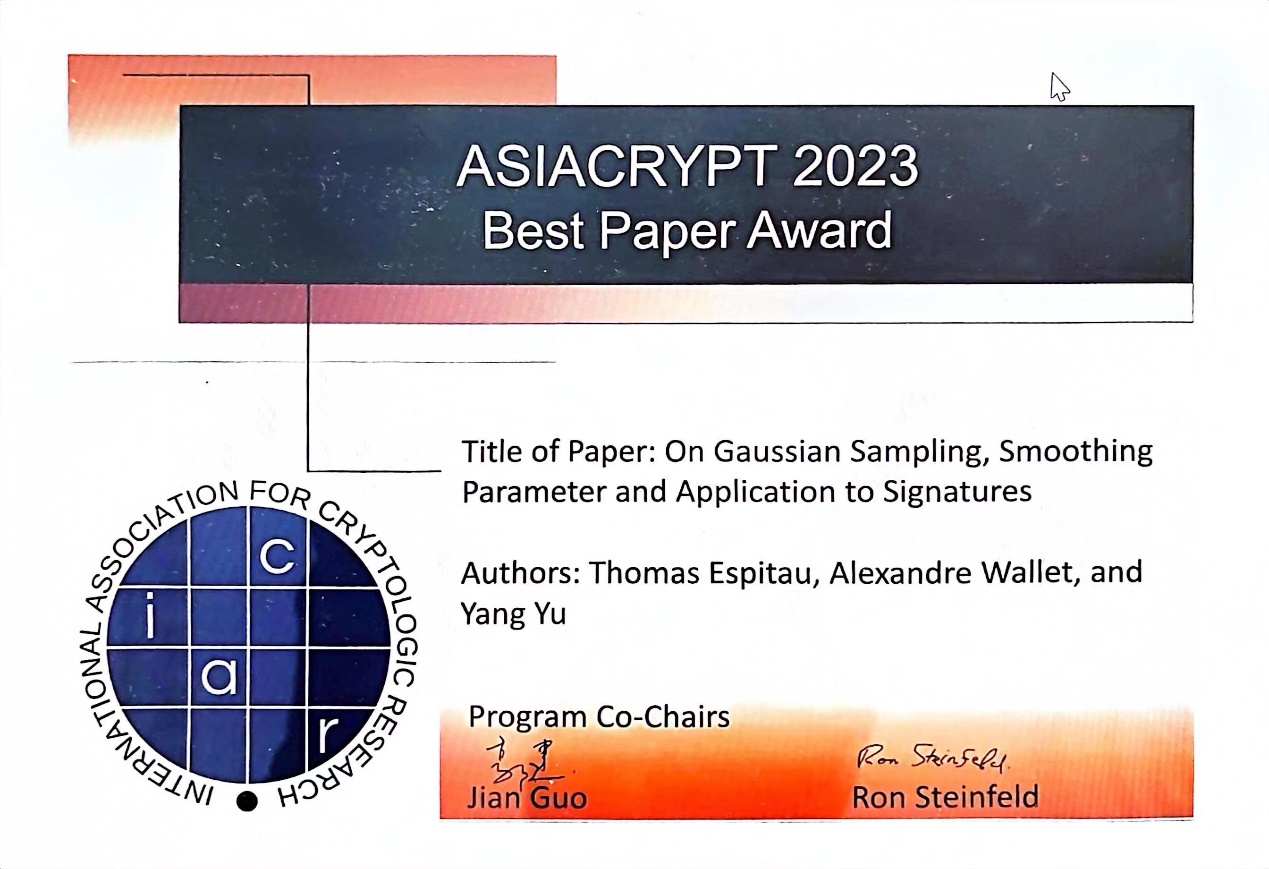 开云新闻网1月8日电 由国际密码学会(International Association for Cryptologic Research,IACR)主办的2023年亚洲密码会议(ASIACRYPT,简称亚密会)近日在中国广州举行。大会评选出两篇最佳论文,其中一篇全部由kaiyun开云官方网站王小云院士团队完成,作者包括高等研究院副研究员王安宇(通讯作者)、喻杨和王小云院士,博士生江锴杰、刘国霄和本科生罗横溢;另外一篇由王小云院士团队骨干成员喻杨(通讯作者)与两位国际密码专家托马斯·艾斯比托(Thomas Espitau)和亚历山大·沃莱特(Alexandre Wallet)合作完成。两篇最佳论文因在后量子密码算法设计与后量子密码数学难题等价性证明方面的杰出贡献而获此荣誉。