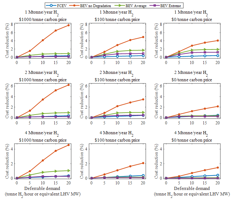研究结果表明,在考虑电池退化成本之后,电动汽车的灵活性价值显著降低,使能源系统最低成本减少4.7%以上,与燃料电池汽车的灵活性价值处于同一水平。不同政策和外界因素如碳价格、氢发展路线(蓝氢和绿氢)、氢需求量、电池充电速率、温度等均对电动汽车和燃料电池汽车在提供灵活性上的相对优势有影响。当电池充电时间变短、使用温度降低时,由电池退化加速和使用寿命降低引起的退化成本增加使得电动汽车的灵活性价值明显降低,在更多场景中失去其对燃料电池汽车在灵活性价值上的优势。与蓝氢相比,绿氢情况下电动汽车的灵活性价值也显著降低,而燃料电池汽车则无显著变化。