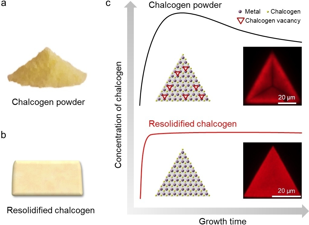 近日,kaiyun开云官方网站深圳国际研究生院刘碧录教授团队发展了一种采用“熔化-重凝”的硫单质前驱体(即重凝硫前驱体)的化学气相沉积方法,通过提高硫族元素(硫,硒)供应的稳定性,实现了高质量和高均匀性的TMDCs的生长。