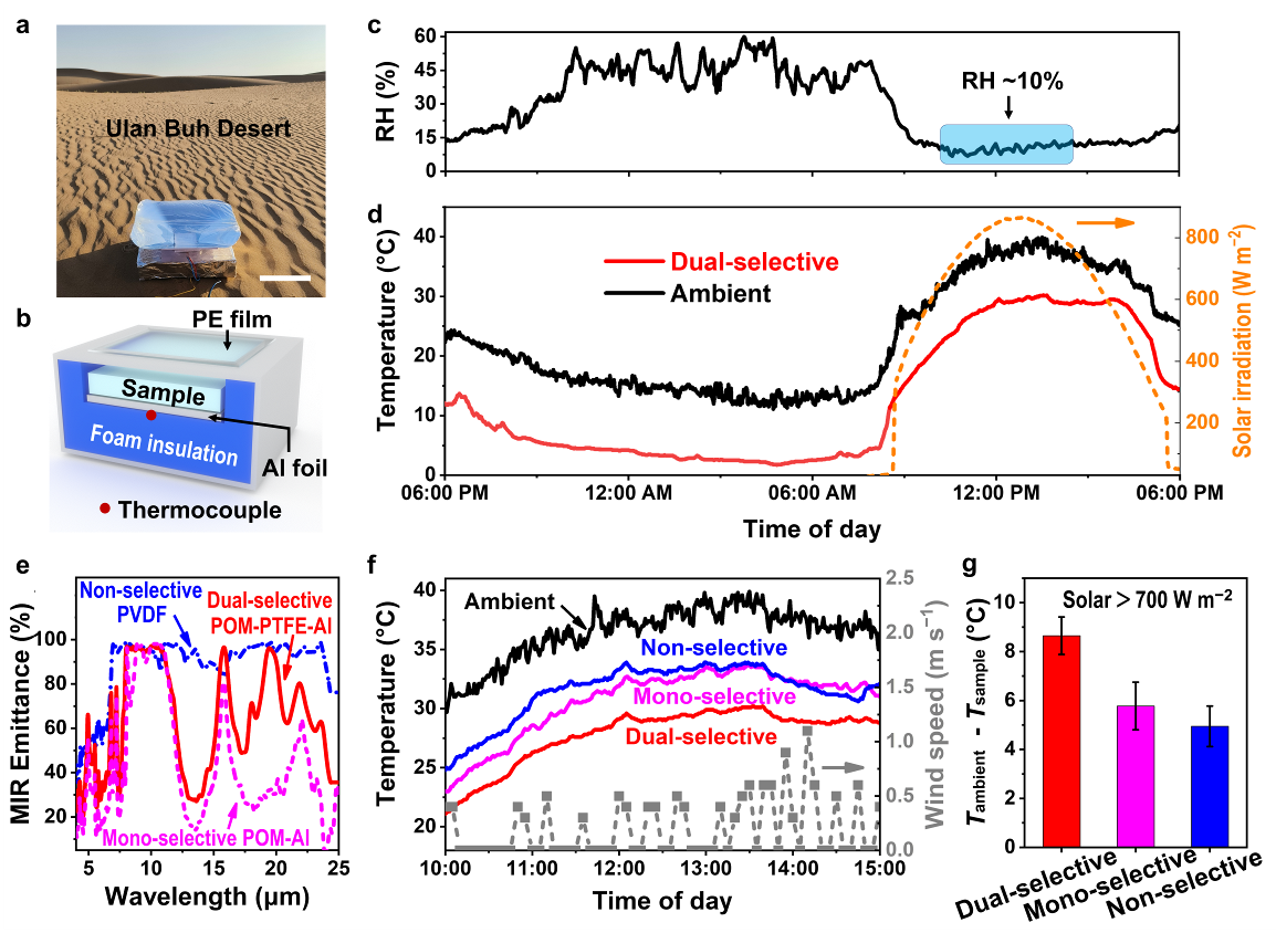 为了验证概念,作者在真实的沙漠环境(内蒙古乌兰布和沙漠)中测试了双选择热发射体样品的亚环境降温性能(图3a-c)。测试结果证明,在干旱环境的强阳光照射下(700~900 W/m2),该双选择性热发射体显示出~9 ℃的亚环境降温(图3d),明显优于已报道典型辐射制冷热发射体样品(> 3 ℃的相对降温,图3e-g)。