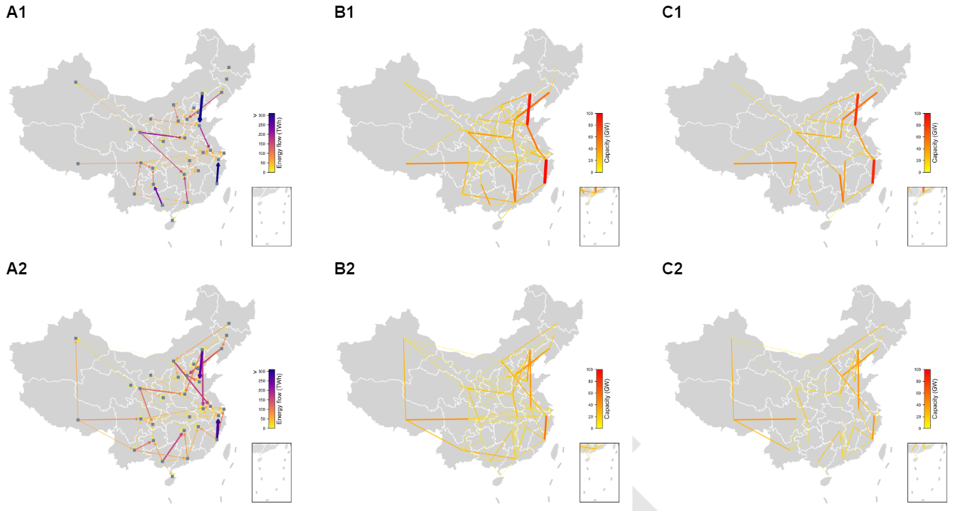 研究的基准情景结果还显示,2060年的跨省传输容量将提高到2020年水平约3倍。其中,扩张幅度最大的区域线路为蒙西—山东(由约1000万千瓦提高到9000万千瓦);部分其他重要的南北方向电力传输通道也需要进一步加强,例如福建—浙江需要新增约7000万千瓦容量将福建的海风发电输送至浙江。图3显示了跨省电力传输(子图A1)、总容量(子图B1)与相对2020年的新增容量(子图C1)情况。