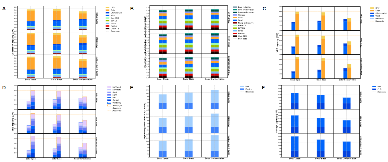 图4.不同土地利用政策严格程度下的优化结果,(A):各发电技术最优装机容量;(B):电力系统(不含配电)度电平均成本构成;(C):风电和光伏的装机容量;(D):不同区域风电和光伏的装机容量;(E):传输线路容量;(F):储能装机容量