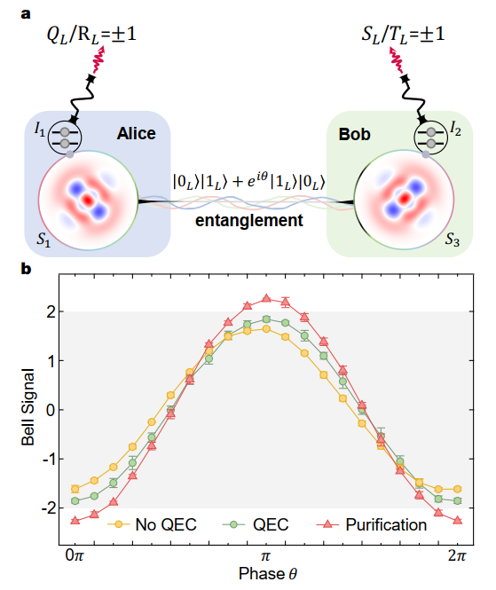 最近,孙麓岩与合作者在解决这一关键问题上取得了突破。他们通过在空间分离的玻色模式中编码量子信息(图1),首次成功实现了受量子纠错保护的纠缠逻辑量子比特。不仅展示了量子纠错技术在保护量子信息方面的巨大潜力,也为实现实用的量子计算和通信网络提供了重要的技术基础。具体来说,研究团队在两个空间分离的玻色模式中,实现了二项式编码的逻辑量子比特,并建立了两个逻辑量子比特之间的纠缠。与物理比特之间的纠缠不同,逻辑比特之间的纠缠对局域噪声有更强的抵御能力,并且可以通过局域量子纠错操作进行恢复,而不是直接耗散到环境中。研究人员通过连续量子纠错操作对纠缠逻辑量子比特进行保护,使纠缠逻辑量子比特的相干时间相较于未受保护的状态提高了45%(图2)。更进一步,研究人员还首次证明了通过错误探测以及提纯,纠缠逻辑量子比特能够违反贝尔不等式(图3)。