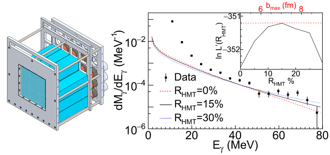 第三幕《捕捉原子核碰撞最初的那束光》:该片段主要讲述通过测量重离子碰撞中的高能光子谱来认识原子核内高动量成分和短程核子-核子关联的故事。首先让我们想象一下原子核内部的情形,研究表明,原子核内的核子并不“安静”,像一屋子嘈杂的人群那样。但核子间存在一定的几率形成配对状态(短程关联),类似形成了一对“舞伴”。理论上认为,这种关联会导致核子动量分布出现一个显著的高动量成分。为了从实验上验证这个图像,肖老师团队在CSHINE中加入高能光子探测阵列,去捕捉碰撞早期的那束光。通过测量高能韧致辐射光子能谱,并与理论计算结果对比,他们在90%的置信度水平上,揭示了原子核内核子高动量成分的存在。这个工作从一个全新的视角展现了原子核内核子-核子短程关联的性质,相关结果最近在PhysicsLetterB上发表[Physics Letters B 850, 138514 (2024)]。