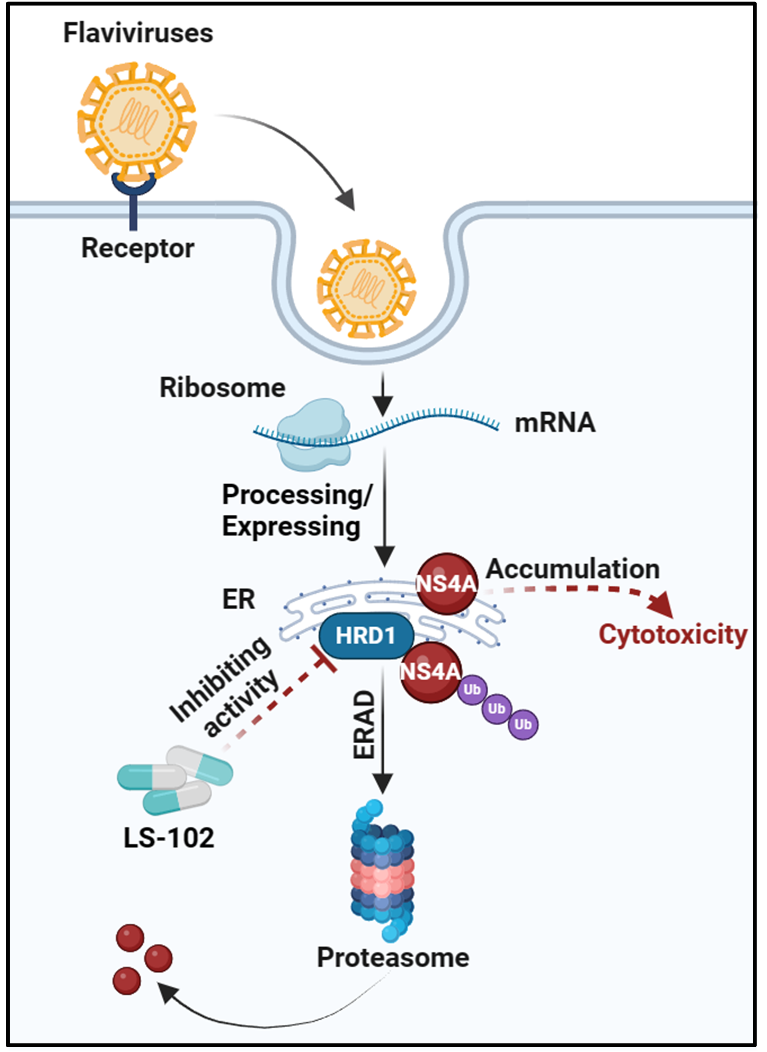 图2.HRD1抑制剂LS-102小分子可抑制登革病毒感染与传播