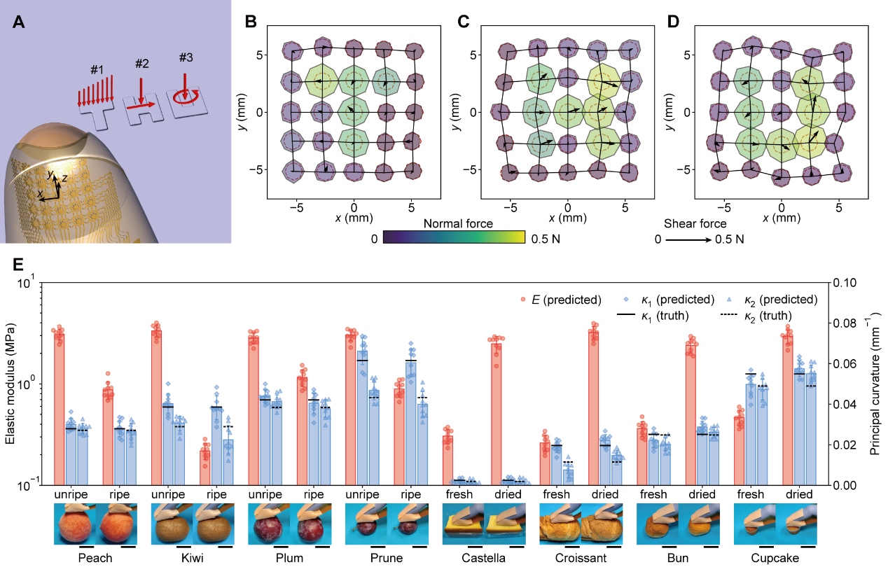 图2.基于新型电子皮肤器件研制的触觉系统:时空映射与模量曲率定量测量。图A-D为时空映射图;图E为利用该触觉系统测量食物、水果模量与曲率的实验图片及测量结果