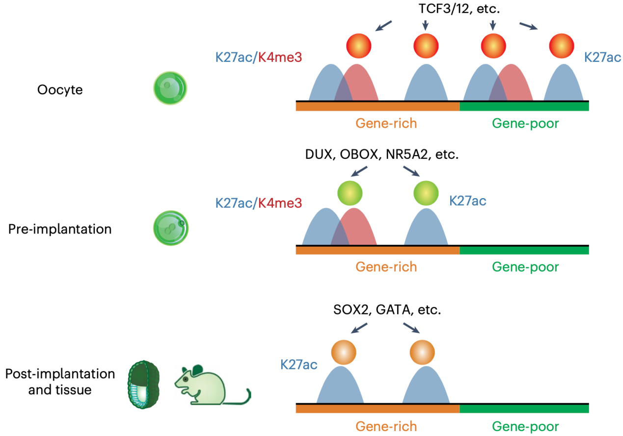 开云新闻网6月7日电 哺乳动物的卵子成熟和早期胚胎发育是一个高度复杂的过程,需要精确的基因调控和表观遗传调控。然而,其转录调控网络及相关元件目前还有待深入研究。增强子作为调控基因表达的重要元件能够帮助远程激活和调控基因表达。然而,由于实验材料的稀缺,增强子在哺乳动物卵子发生和早期胚胎发育过程中参与基因表达调控的机制目前鲜有研究。在小鼠等哺乳动物卵子及早期胚胎中,诸多表观基因组特征呈现出非经典模式,且在受精及着床前后经历了剧烈的重编程过程。有趣的是,基于报告基因的早期研究提示小鼠卵子及合子中可能缺乏增强子活性。然而,这与卵子和胚胎中高度活跃的转录似乎存在矛盾。那么在哺乳动物卵子发生和早期胚胎发育过程中,是否存在活跃的增强子?如果有,这些增强子是如何参与转录调控的?有哪些关键转录因子协同增强子在这个过程中调控基因表达?由于早期胚胎材料稀缺,这些问题一直是领域内的未解之谜。