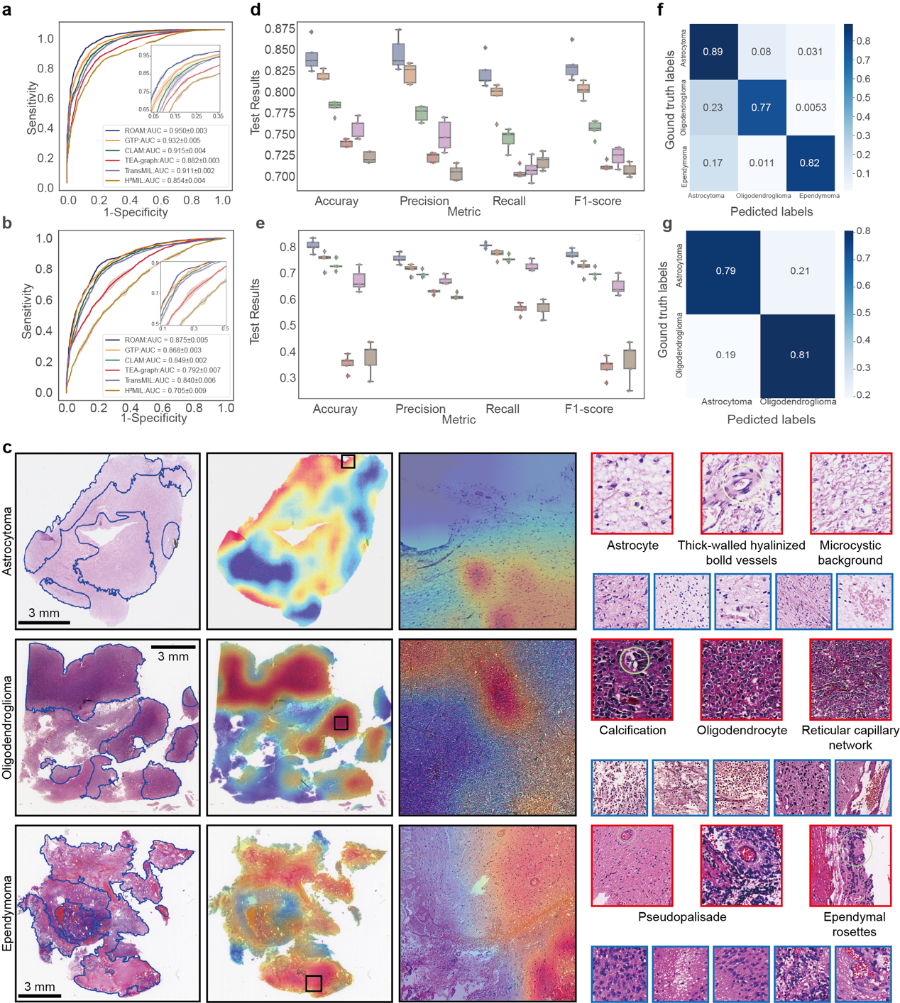 研究人员在内部数据集和TCGA外部数据集上评估了ROAM的分类表现。ROAM优于包括CLAM、TransMIL、GTP、TEA-graph、H2MIL在内的五种已有方法,在内部数据集胶质瘤诊断相关的任务上均优于其他基线方法(图2a)。同时,ROAM也具有良好的泛化性,仅使用内部数据集进行训练并在外部TCGA数据集上测试,ROAM的总体表现仍然优于其他基线方法。此外,ROAM预测的可视化结果也表明该方法总结的诊断依据与临床诊断标准非常一致。