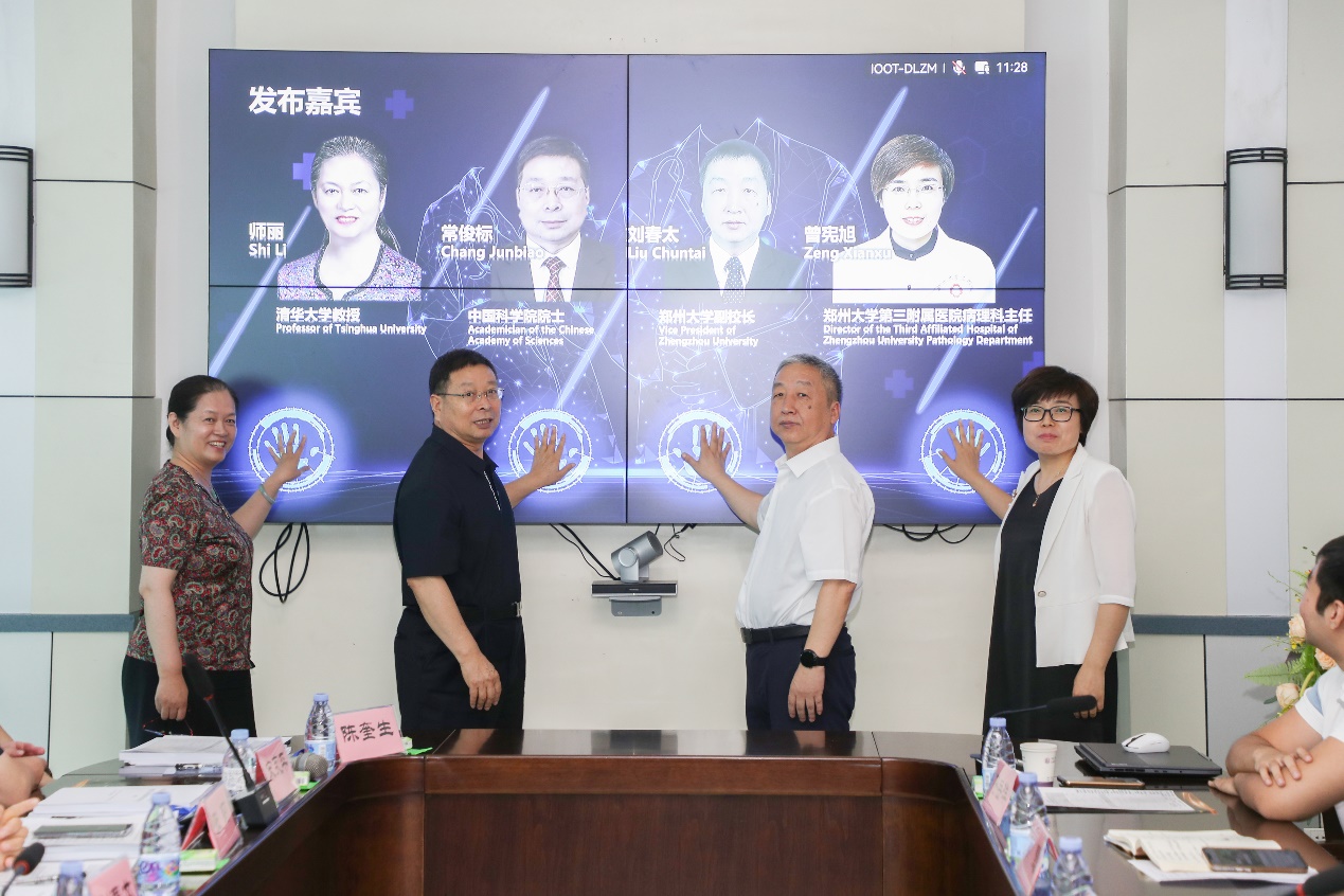 发布会现场,常俊标、刘春太、师丽及曾宪旭共同完成了妊娠滋养细胞疾病病理大模型GTDoctor及智能辅助诊断系统GTDiagnosis的发布。