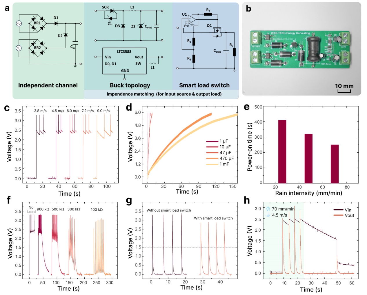 此外,为解决风力和雨滴TENG输出高阻抗脉冲电压难以直接为标准电子设备供电的问题,研究团队开发了具有创新设计的电源管理电路以支持集成的风雨能收集系统,结构上包括全桥整流器、buck降压电路和特殊设计的智能负载开关。通过引入降压拓扑和智能负载开关,实现了输入源阻抗匹配和输出负载阻抗匹配,从而高效利用能量。LTSprice模拟和实际实验验证了该电路,能够在不同负载条件下提供稳定的直流电压输出。