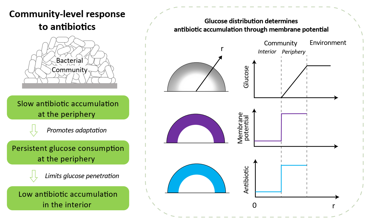 细菌群体能够更好地适应抗生素,并通过持续性的葡萄糖消耗维持群体的空间异质性,确保了群体在抗生素撤除后能够更好地恢复生长
