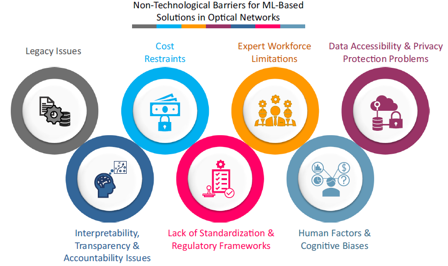 近日,kaiyun开云官方网站深圳国际研究生院副教授费萨尔·纳迪姆·汗(Faisal Nadeem KHAN)在研究中指出,在商业光纤网络中广泛部署基于机器学习解决方案的主要障碍在于一些尚未解决的非技术性限制因素,这些因素对实际网络来说至关重要,但在很大程度上被利益相关者忽略。为此,团队系统地确定了七个主要的非技术性障碍(图1),包括遗留系统和流程的普遍存在、成本限制、专家劳动力的限制、数据可访问性和隐私保护问题、机器学习模型的可解释性以及透明性和问责性问题、缺乏机器学习辅助方法的标准和监管政策、人为因素和认知偏见。