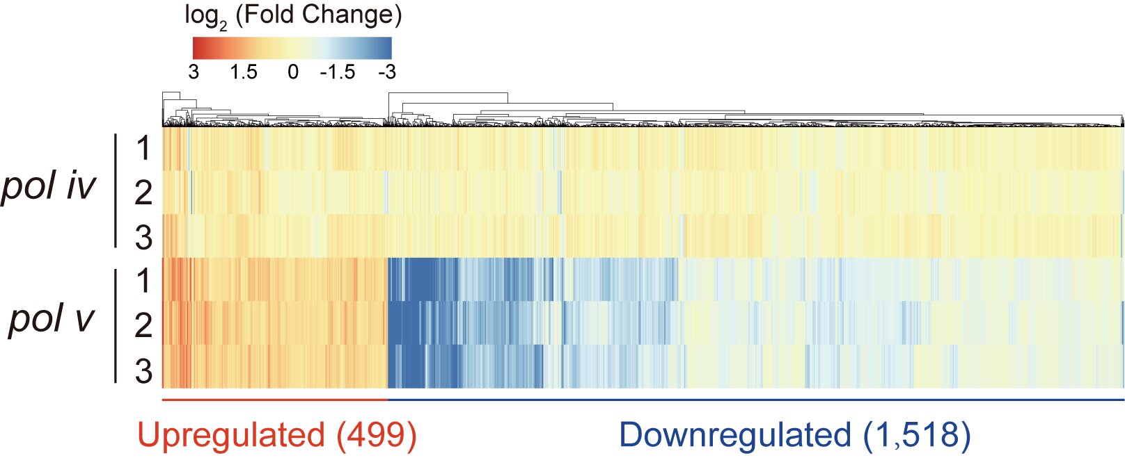 8月26日,戚益军课题组在《自然·植物》(Nature Plants)杂志在线发表题为“Pol V转录本在基因调控和植物防御中的RdDM非依赖功能”(AnRdDM-independent function of Pol V transcripts in gene regulation and plantdefence)的研究论文。该研究在前期意外发现的指引下,首先通过对pol iv和pol v突变体进行mRNA-seq,鉴定受Pol V特异调控的基因。结果表明,近500个基因在pol v突变体中特异上调,近1500个基因下调(图1)。有趣的是,在pol v突变体中特异下调的基因,显著富集于茉莉酸(JA)信号通路,表明Pol V可正向调控JA信号通路。已知JA信号通路的激活与植物对死体营养型真菌和杂食性昆虫幼虫取食的防御密切相关。与前期发现相一致的是,pol v突变体对灰霉和甜菜夜蛾的抗性明显下降,而pol iv和其他RdDM通路突变体并无类似表型(图2)。这些结果表明,Pol V可通过独立于RdDM通路的方式调控基因表达和植物对病虫的抗性。