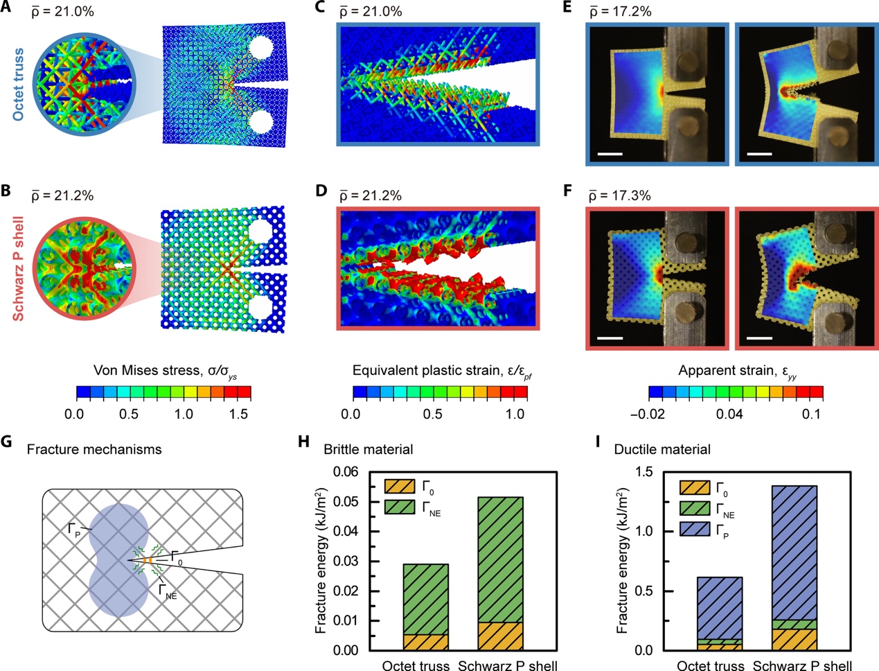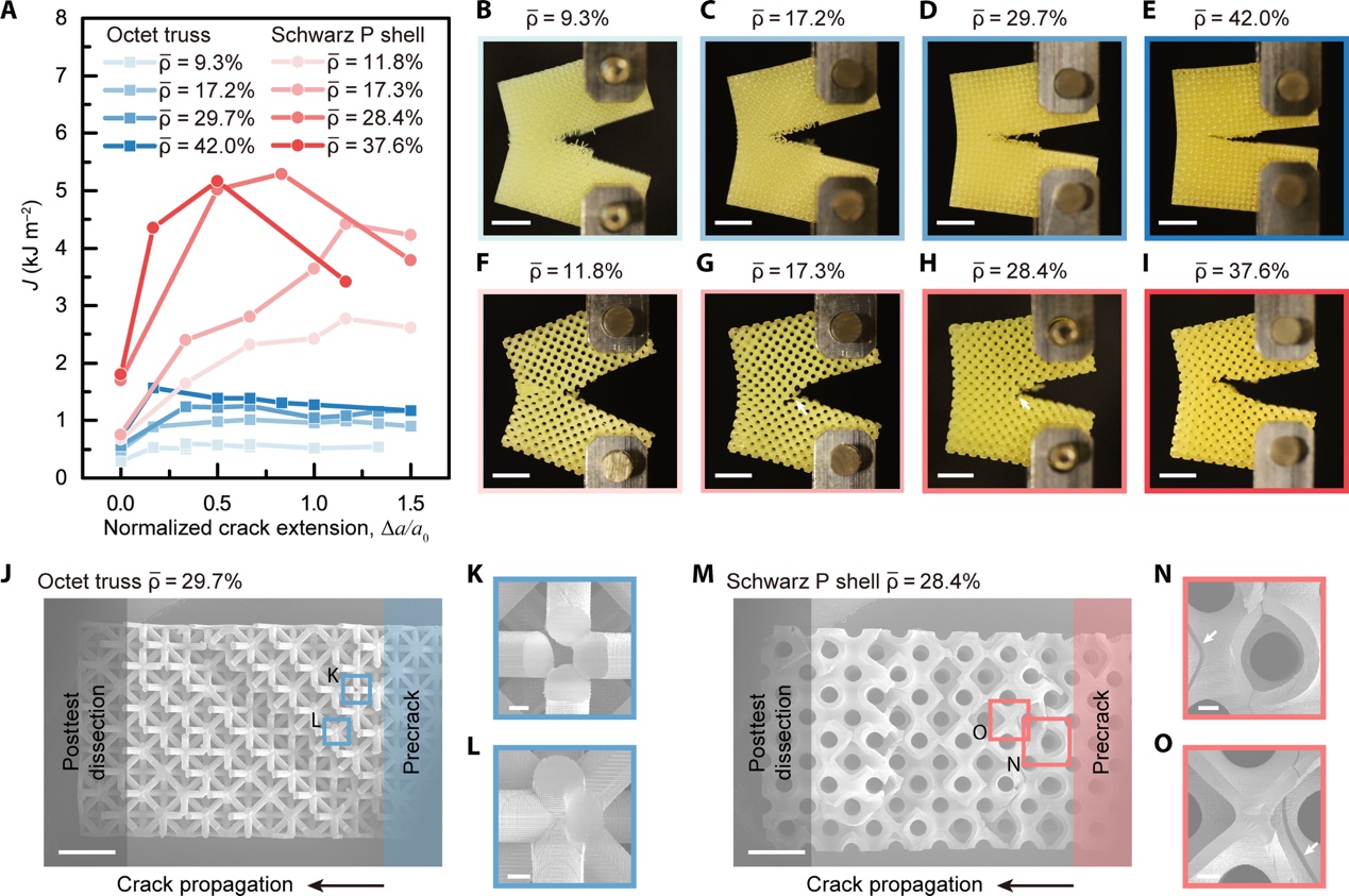 图2.桁架和曲壳点阵超材料的断裂韧性和断裂行为对比