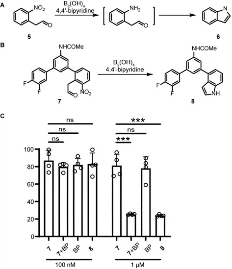 吲哚是一种多功能药效团,通过不同的作用机制发挥广泛的药理活性。研究人员设想邻硝基乙醛在硝基还原后可能会环化形成吲哚环(图4A)。基于此设想合成了邻硝基苯乙醛衍生物7,前药7发生级联化反应转化为吲哚衍生物8(图4B),即一种抗有丝分裂药物。当用前药7,B2(OH)4/4,4'-二联吡啶共同孵育细胞后,表现出显著的细胞杀伤效果(图4C),表明在催化剂的存在下,7在细胞中转化为8。这些实验表明,硝基还原-环化级联可以作为活细胞中吲哚合成的补充策略。