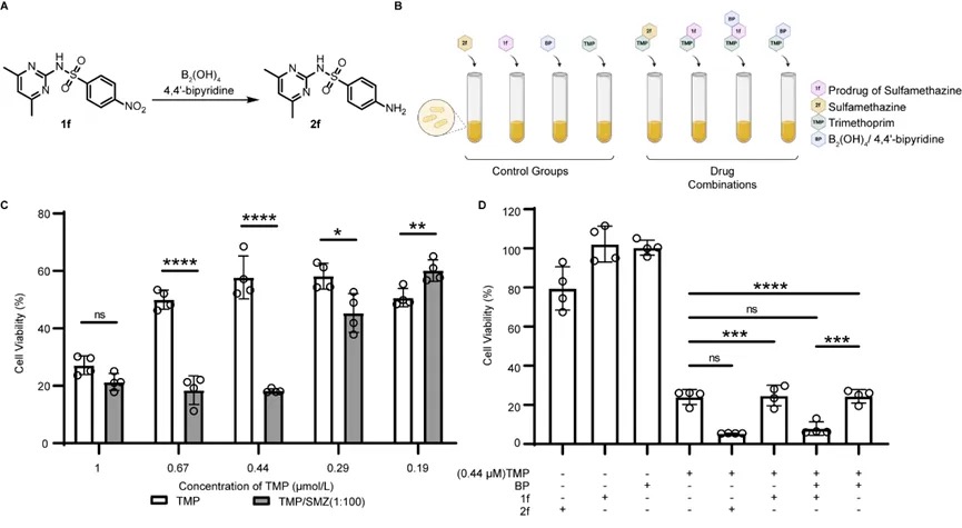 甲氧苄啶(TMP)和磺胺的协同给药用于治疗细菌感染。研究人员尝试将硝基还原的方法用于抗菌前药的激活。研究人员首先优化了TMP和磺胺二甲嘧啶(SMZ)的浓度比例,以达到最大的细菌生长抑制效果。结果显示,0.44μM TMP与44μM SMZ组合的协同效应最高(图3C)。在接下来的测试中,0.44μM TMP、44μM前药1f和B2(OH)4/4,4'-二联吡啶的组合处理大肠杆菌的抑菌效果与0.44μM TMP、44μM 2f效果相当(图3D),证明了4,4'-二联吡啶介导的氮还原为抗微生物治疗提供了一种互补的前药策略。