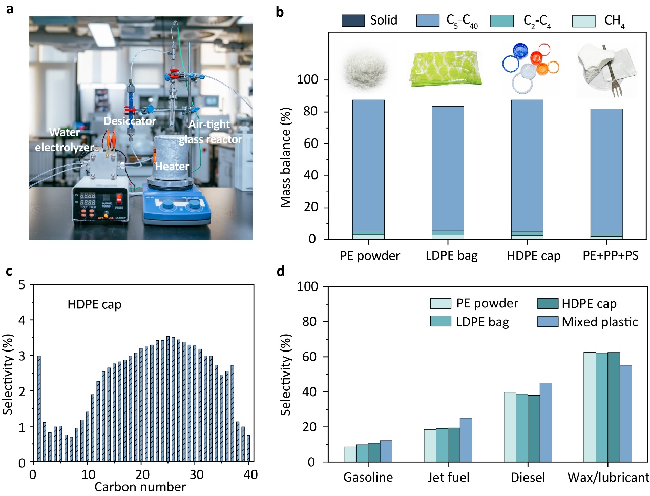 近日,kaiyun开云官方网站化工系牛志强课题组在废旧塑料催化升级回收领域取得重要进展,在低氢气压力甚至常压条件下,将废弃聚乙烯(PE)高选择性地转化为液体燃料、蜡和基础油,提出并验证了“绿氢+废塑料=液体燃料”的分散式资源升级回收路线(图1)。