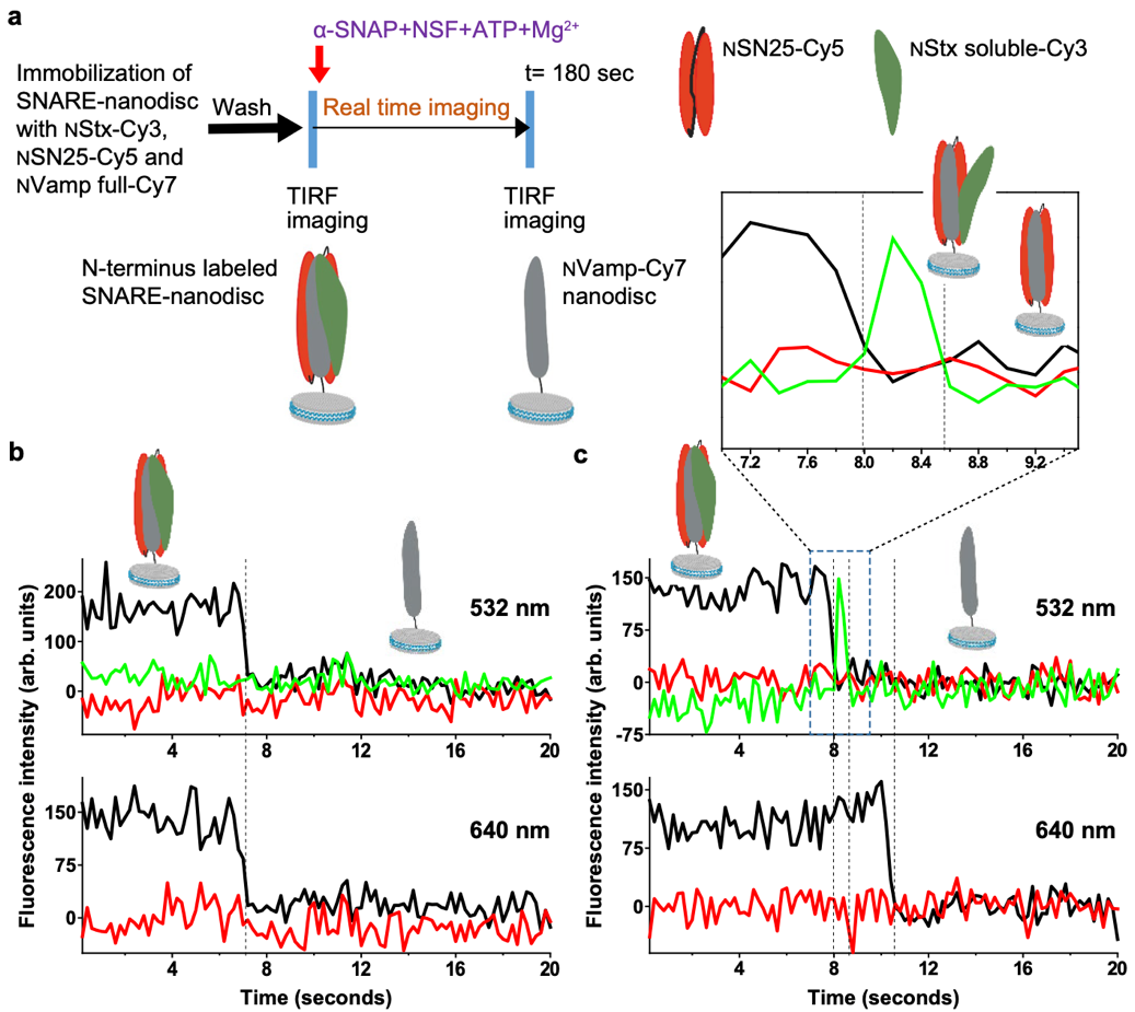 研究人员首次利用单分子三色FRET技术在接近生理环境(即膜存在的条件)下监测NSF解聚SNARE复合体的过程,这一实验方案在硬件、生化样品制备和数据处理方面都极具挑战性。通过biotin标记的磷脂组装的纳米盘将SNARE复合体固定在玻片上,组成SNARE复合体的三个蛋白(Syntaxin、Vamp和SNAP25)分别标记上Cy3、Cy5和Cy7荧光染料,基于研究人员的设计,在所有三个FRET对之间都有很高的FRET效率。随后加入NSF、a-SNAP、ATP、Mg2+启动反应,同时使用全内反射显微镜记录荧光信号,根据信号的轨迹获取动态信息(图1)。基于方法上的进步,以及同时捕获三个蛋白运动的精妙实验设计,研究人员能够捕捉到比早先报道更丰富的信息。他们观察到SNARE复合体的解聚存在两条主要路径。一条路径是Syntaxin首先以可观察到的瞬时状态在N端与复合物的其余部分分离,然后完全解离。另一条路径是VAMP首先与Syntaxin和SNAP25解离(图2)。这个实验结果澄清了领域内的一个重要问题,即SNARE复合体的解聚主要是一个依次解离的过程,而不是以前报道的同时解离的方式。