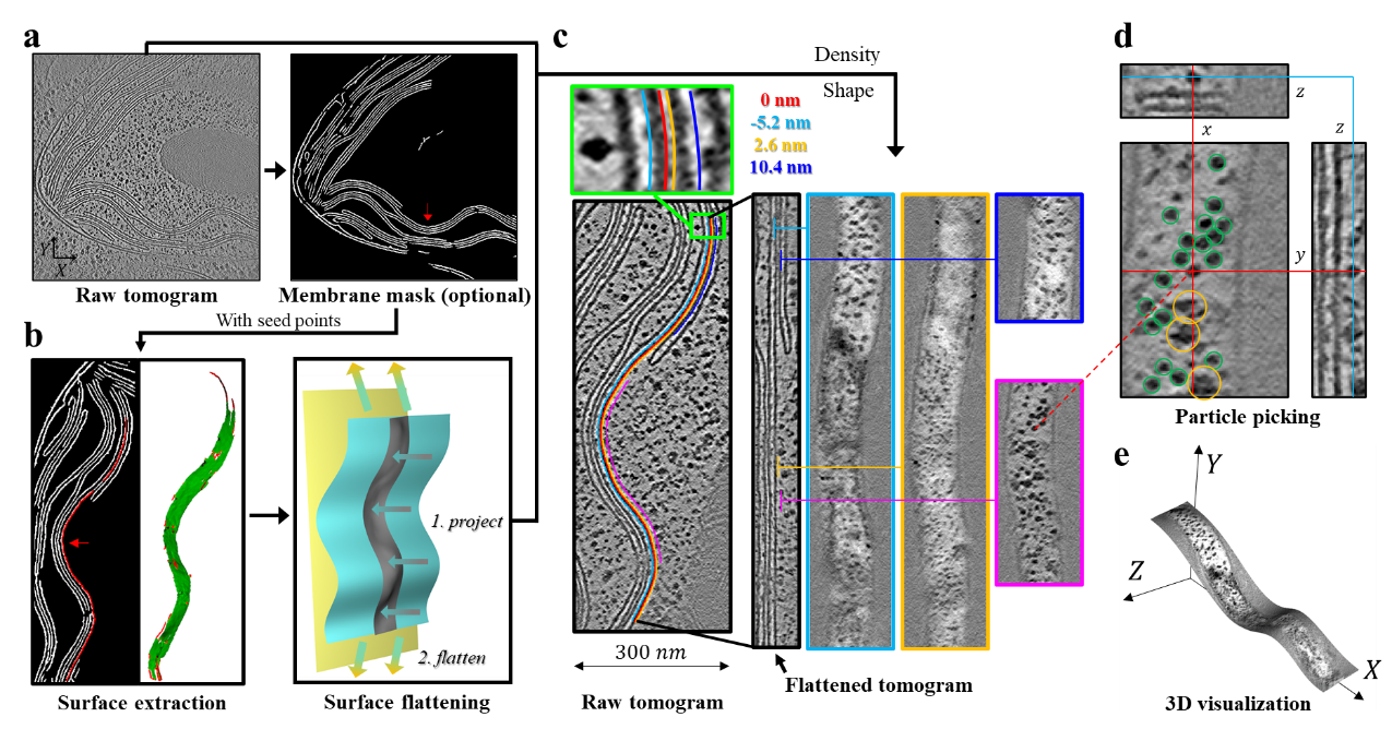 1月8日,kaiyun开云官方网站生命学院李雪明副教授课题组在《自然·通讯》(Nature Communications)在线发表题为“MPicker:冷冻电子断层成像中膜蛋白的可视化与挑选”(MPicker:visualizing and picking membrane proteins for cryo-electron tomography)的研究论文。该论文报道了一种基于“膜展平”的方法,通过在“展平tomogram”中进行操作来降低膜蛋白可视化与挑选的难度(图1)。该方法首先通过膜分割或者手动标注定位感兴趣区域(一片膜),然后在tomogram中对这片膜及其周围的区域进行变形处理,最终把这个局部区域展平为一个包含平整膜结构的新tomogram,也就是展平tomogram。在这个新生成的展平tomogram中,原本弯曲的膜会变成一个平板,膜厚度与蛋白取向局部保持不变。展平tomogram中每一层二维截面都对应一个平行于膜的等距面,使得膜表面的蛋白信号可以轻易地以二维图像的形式被展示。这起到了降维的效果,降低了膜蛋白分析的空间复杂性,改善了膜上和膜周围蛋白质的可视化效果。