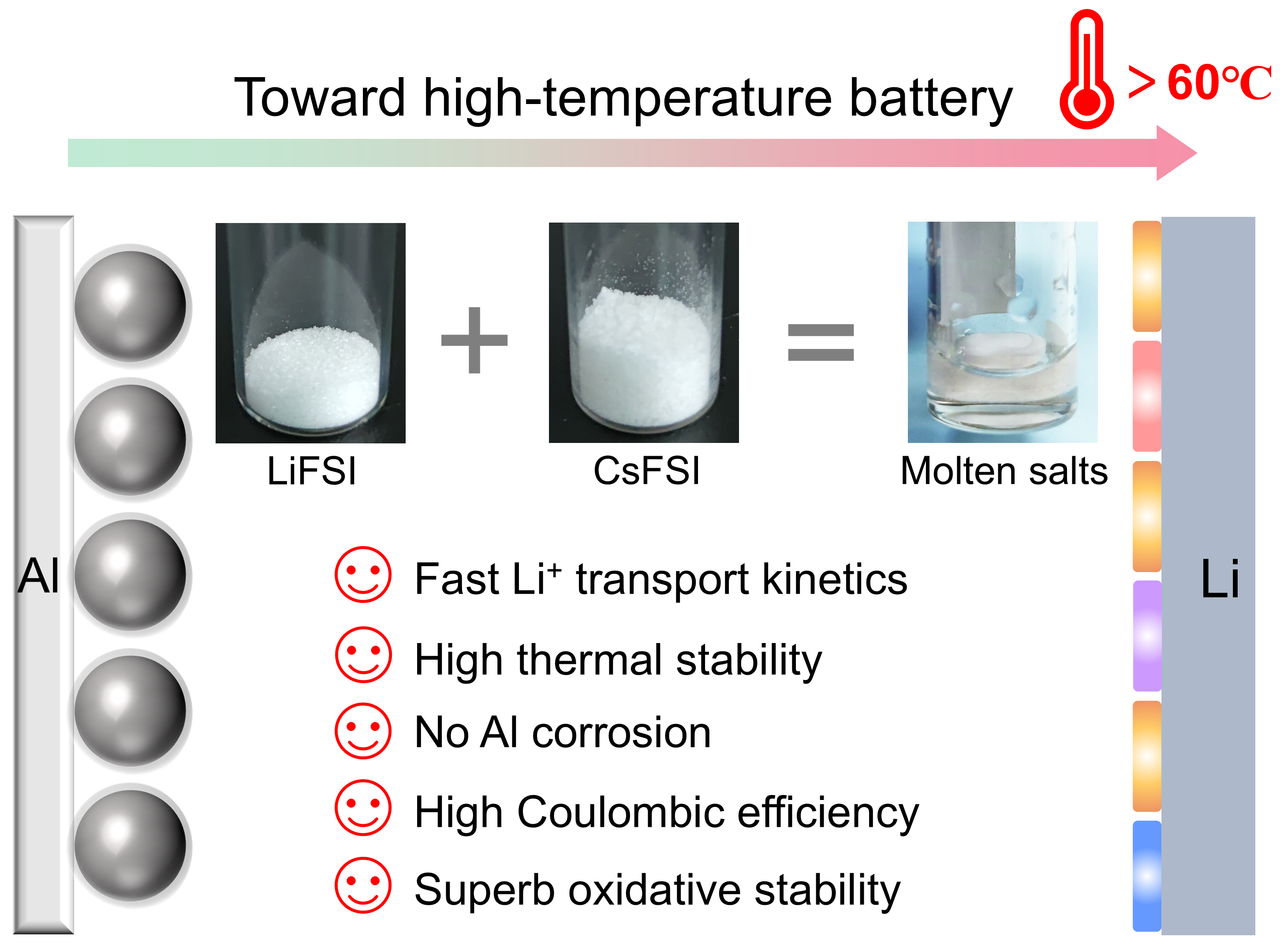 kaiyun开云官方网站化工系副教授刘凯和副研究员陈翔合作,报道了一种具有高固有热稳定性和电化学稳定性的无溶剂熔融盐电解质,由碱金属阳离子和氟化磺酰亚胺阴离子组成,表现出优异的锂离子传输动力学,包括低活化能、高锂离子电导率和高迁移数,揭示了强的阳离子-阳离子(Li+-Cs+)协同效应促进了锂离子在熔融盐电解质中的扩散行为,可满足高温锂金属的应用需求。