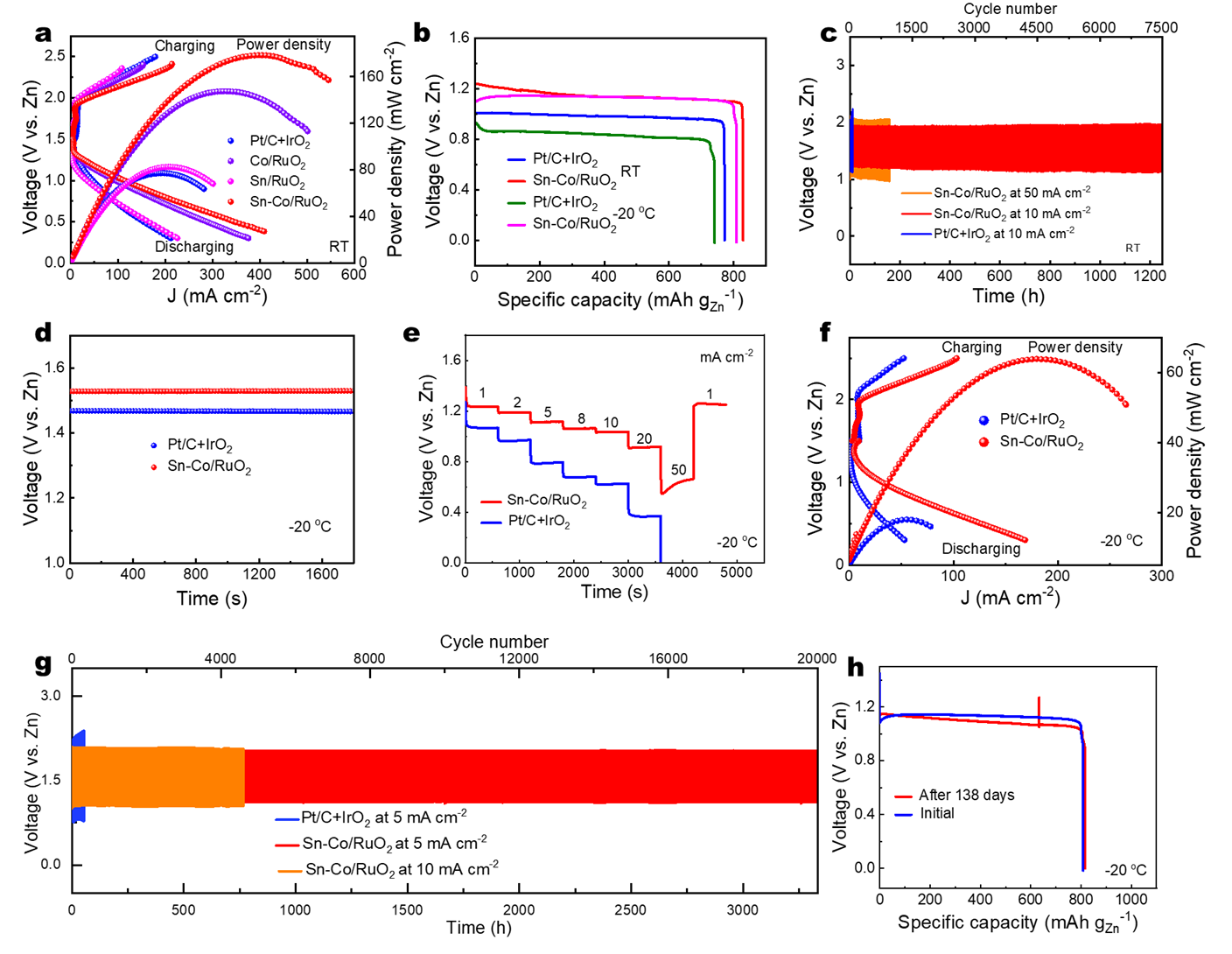 图3.基于Sn-Co/RuO2催化剂的水系可再充锌空气电池性能评价