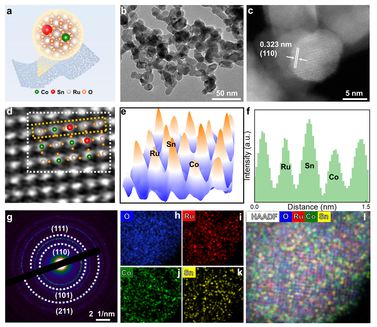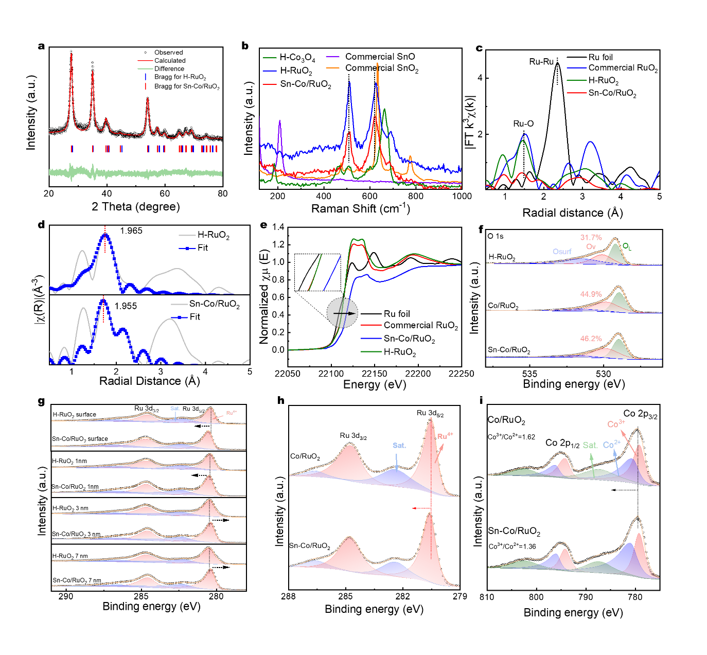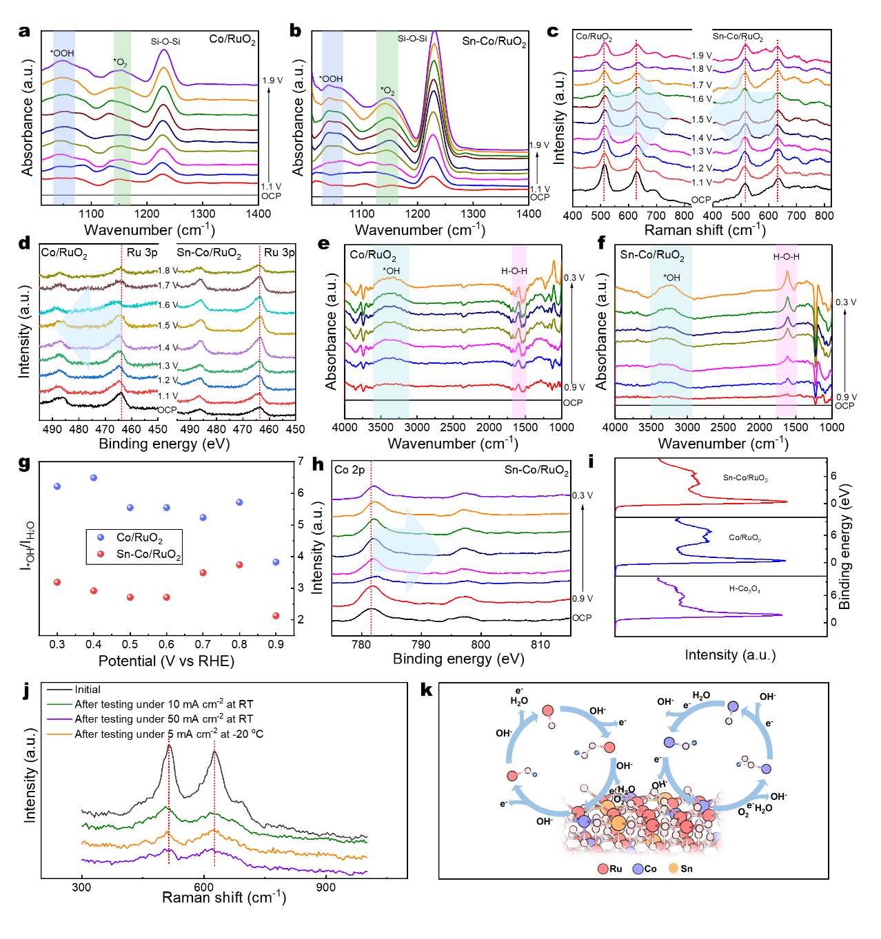 张如范团队从双功能氧电催化剂反应机理出发,理论指导实验,将ORR活性位点钴(Co)和辅助位点锡(Sn)同时引入到OER活性物种二氧化钌(RuO2)的近表面和表面(图1和图2),精确调控原子和电子结构,设计了一种高性能的单相三金属双活性位点氧化物催化剂(Sn-Co/RuO2)。Sn-Co/RuO2催化剂表现出优异的双功能性能,氧电势差(∆E)为0.628V,并且在经过200000圈加速循环测试,ORR性能维持着可观的初始性能。基于Sn-Co/RuO2催化剂的a-r-ZABs在-30-65 ℃的宽温域范围内表现出高的性能(图3)。尤其是在-20 ℃环境下,电池经过138天运行之后,性能几乎无衰减。张如范团队借助原位及非原位的实验对构-效关系进行深度刨析(图4),证实了辅助位点Sn的加入有效地调节了Ru和Co双活性位的原子/电子环境,优化了ORR和OER反应过程中中间产物(*OOH/*OH)的吸附行为,促进了最终产物的释放,降低了产物积累所造成的负面影响,从而到达降低反应能垒和提升电催化性能的目的。