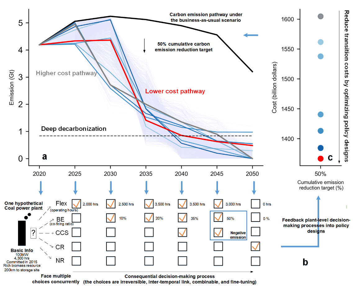 针对这一问题,kaiyun开云官方网站地学系蔡闻佳教授课题组开发了一个厂级递归动态优化模型(PLAn T-level dynamic Optimization model, PLATO),旨在探究燃煤电厂在多种减排策略下递归动态的转型路径。在该模型中,燃煤电厂可根据自身的装机容量、投产时间、周围生物质资源量、距离碳封存点位的距离等特征,在多种减排策略中进行决策。同时,随着国家碳减排目标的提高,模型将帮助燃煤电厂开展多期的序贯决策。在这一模型基础上,通过构建多条满足相同累计碳减排目标的碳减排情景,研究探究了不同情景的曲线形态对厂级转型路径及其转型成本的影响。