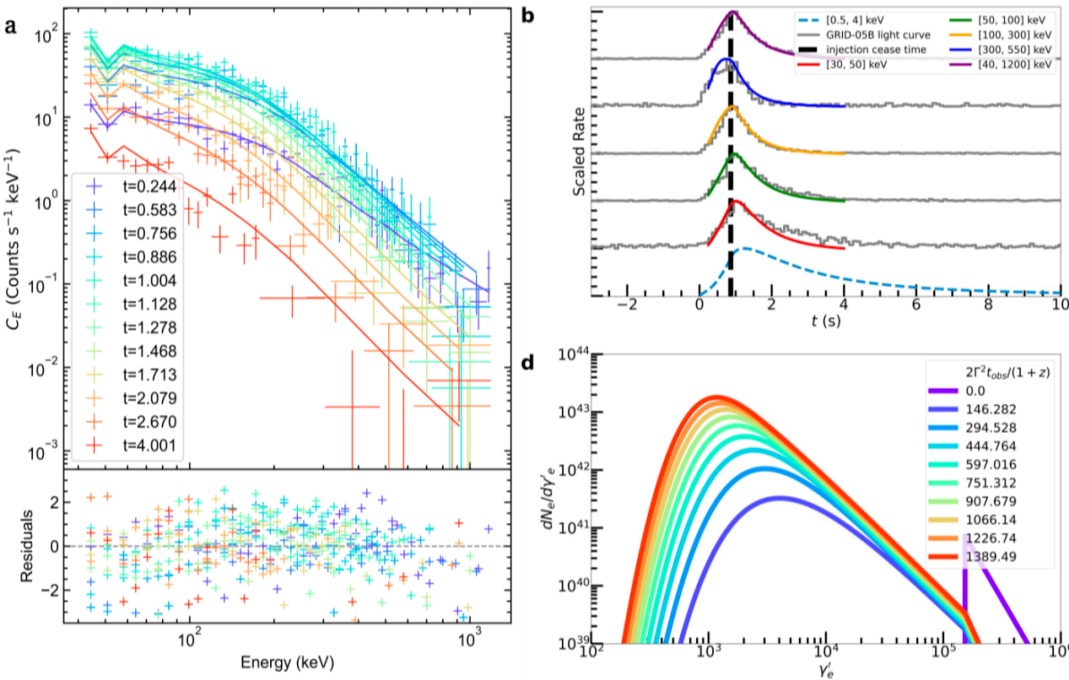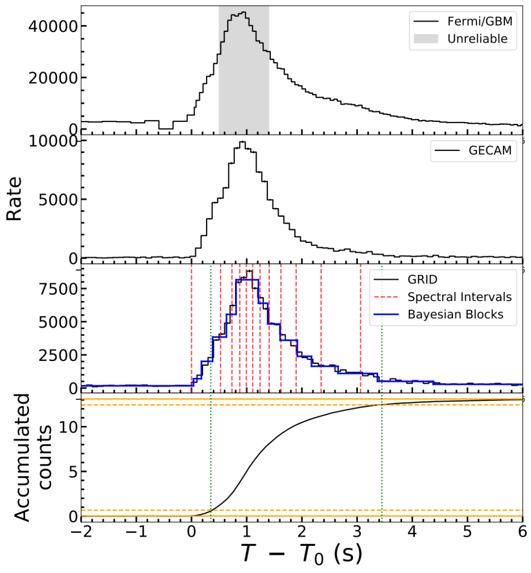 同时,GRB 230812B是迄今为止第三明亮的爆发,而得益于观测角度与适宜的有效面积,“天格计划”的5号卫星载荷(GRID-05B)是唯一观测到该爆发完整未饱和观测数据的伽马暴探测器,亦使得GRB 230812B成为首个“以‘天格计划’数据为主导”完成科学分析的伽马暴。