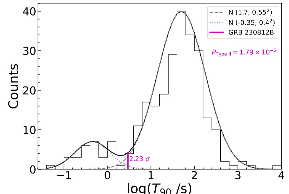 GRB 230812B本身持续时间短,但却与一颗超新星有关,这就对传统观点(即短伽马暴仅起源于致密天体合并)提出了挑战。