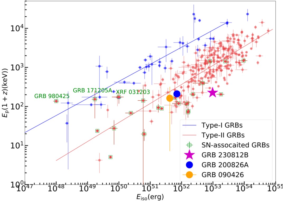 事实上,GRB 230812B并不是首例持续时间异常短的超新星成协伽马暴。2020年曾出现过类似的GRB 200826A。其持续时间仅约1秒,但观测上与一颗超新星密切相关,也同样起源于大质量恒星的坍缩过程。研究团队推测,此类暴发可能归于某个“特殊子类”,它们具有典型坍缩型伽马暴的物理特征,但在持续时间上却大大短于通常的数十秒到上百秒。GRB 230812B的出现恰恰以3秒的持续时间证实了这一预言。