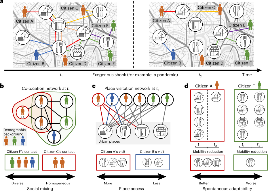 图1.该论文提出的城市移动行为数据动态网络分析框架(a),从网络科学视角对社会交互(b)、场所访问(c)、动态响应(d)三个重要维度构建城市不平等性测量体系